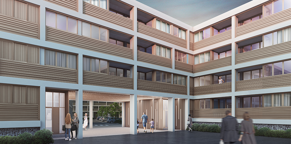 Fabriquée à partir d’une trame constructive répétitive datant de la fin des années 50, l’esthétique demeure qualitative et offre une base de réhabilitation rêvée. Notre projet ne souhaite pas en découdre avec des notions stylistiques. Notre projet désire au contraire faire évoluer l’ADN de ce quartier historique de Lillebonne.