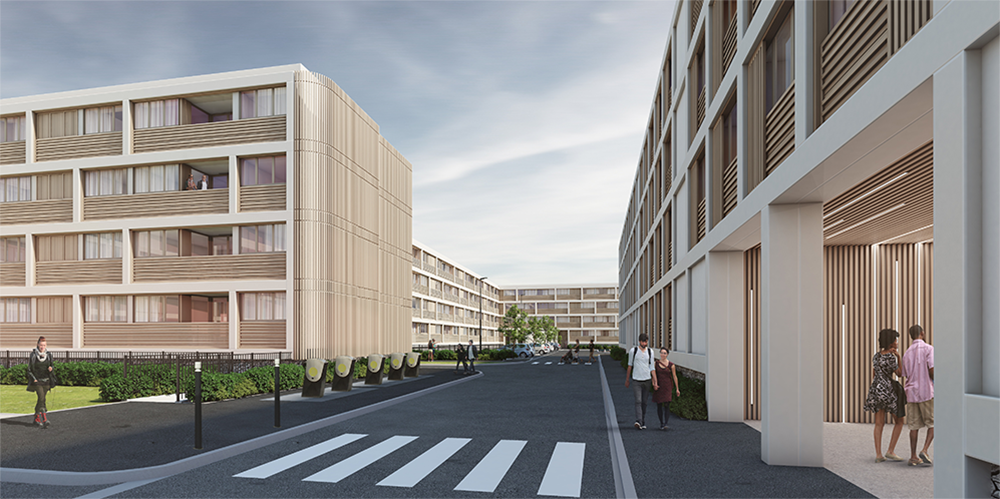 Par conséquent, nous souhaitons la prolonger par un travail simple et élégant des façades afin de ne pas prendre l’ascendant sur le parcours urbain naturel mis en place en deux mille dix-sept. Ce parcours « doux » inter-quartier doit être jalonné à l’échelle du parc Clairval par une architecture de transition également douce et naturelle. Cette transition à l’échelle de la politique de la ville qui parie sur la volonté de développer un écoquartier va permettre d’inscrire durablement l’intégralité de votre patrimoine dans un univers contextuel et tourné vers l’avenir.