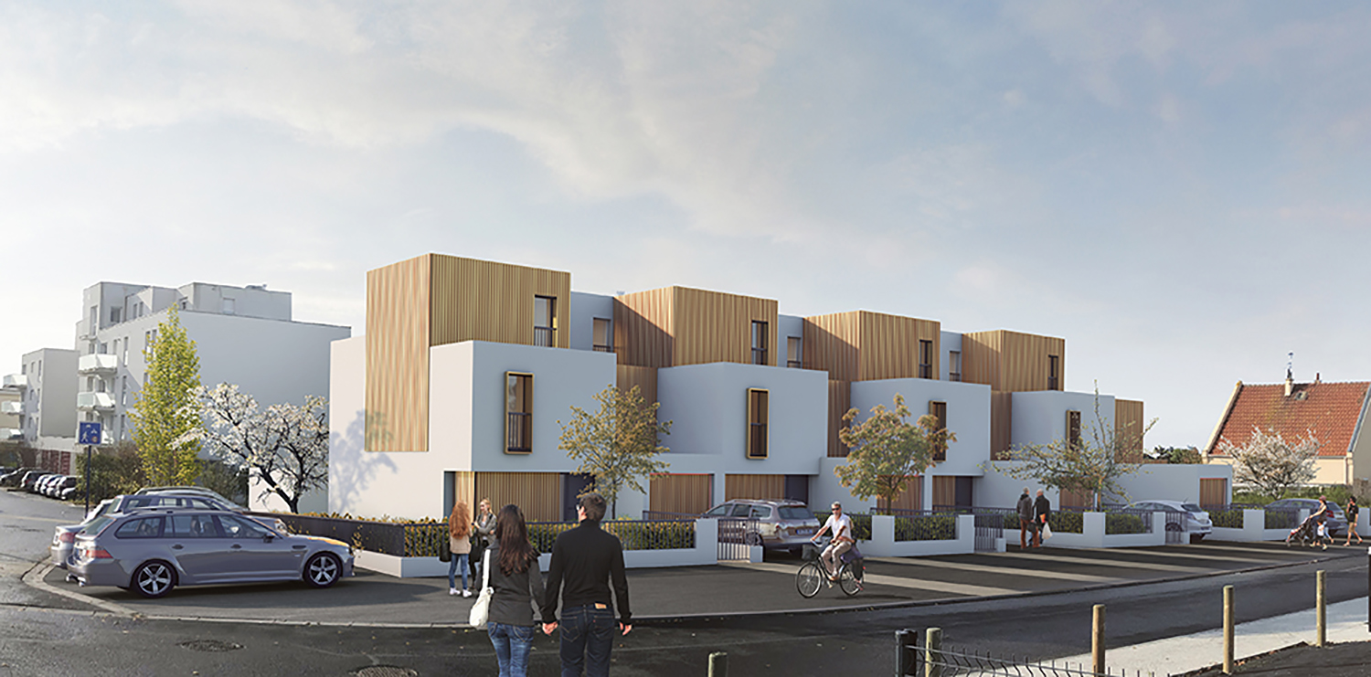 Le « traçage » de cette voirie nous a amenés à privilégier une orientation Nord-sud, qui n’est pas sans rappeler l’implantation des maisons jumelées de l’après-guerre. Les pièces de vie et les terrasses (une à deux par logement) sont donc orientées au Sud. Les pièces orientées au Sud disposent de grandes menuiseries alors que côté nord, les fenêtres sont plus petites.