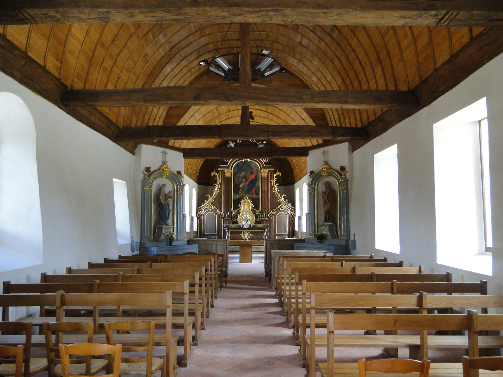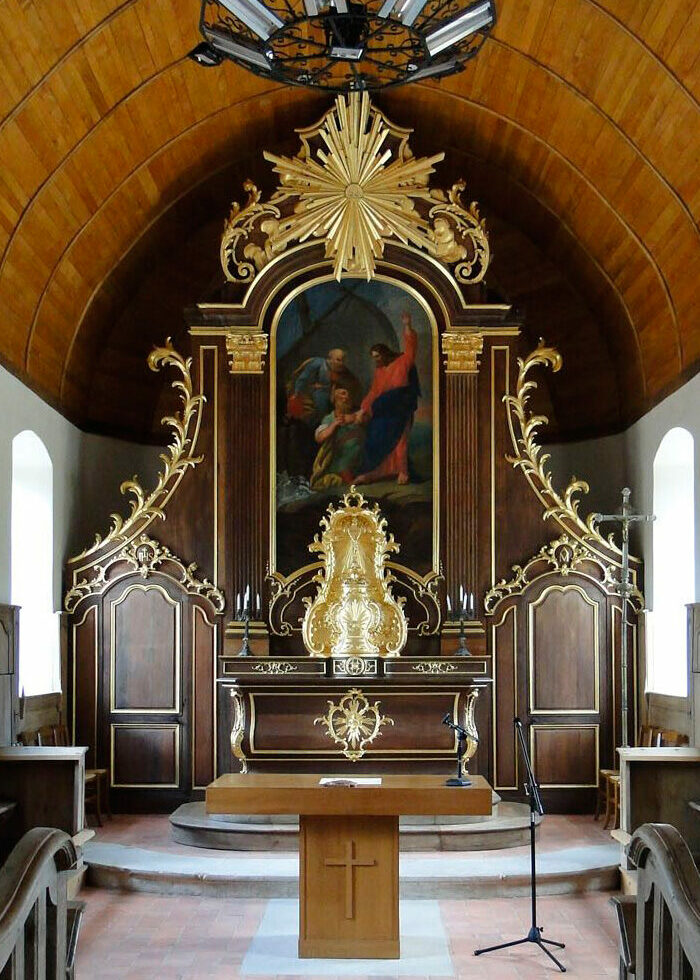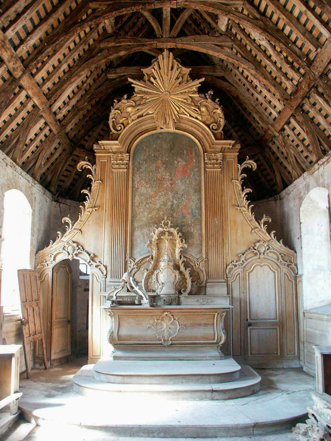 En entente avec l’architecte des bâtiments de France, nous avons restauré le lieu en retrouvant l’aspect du XVIIIème siècle : voûte « coque de bâteau » en chataignier, terre cuite ancienne au sol, murs enduits à la chaux, réfection des boiseries du choeur et teintes d’origine.