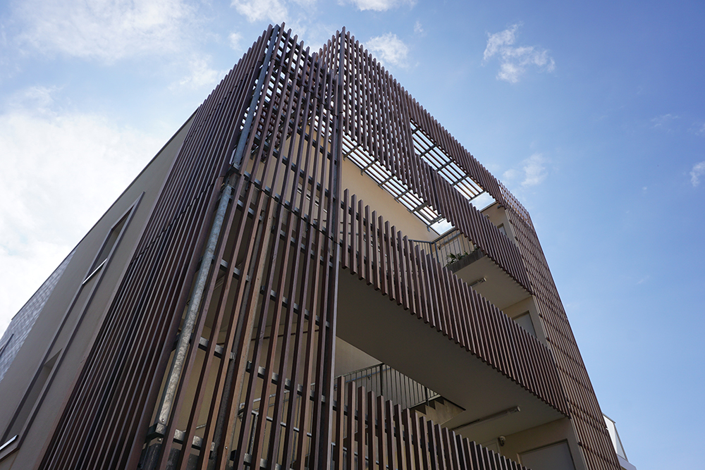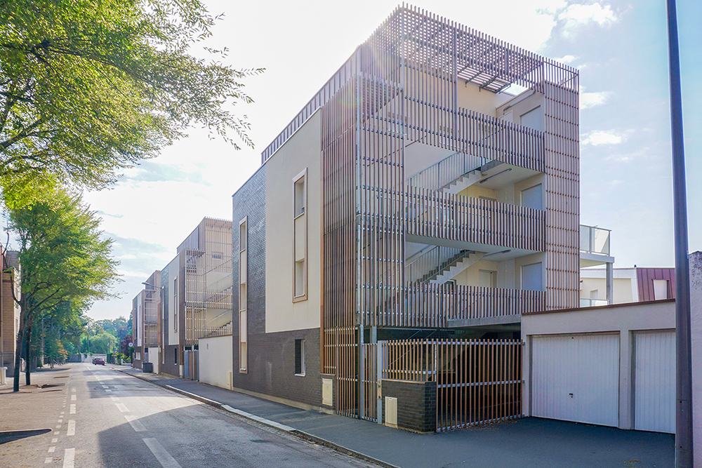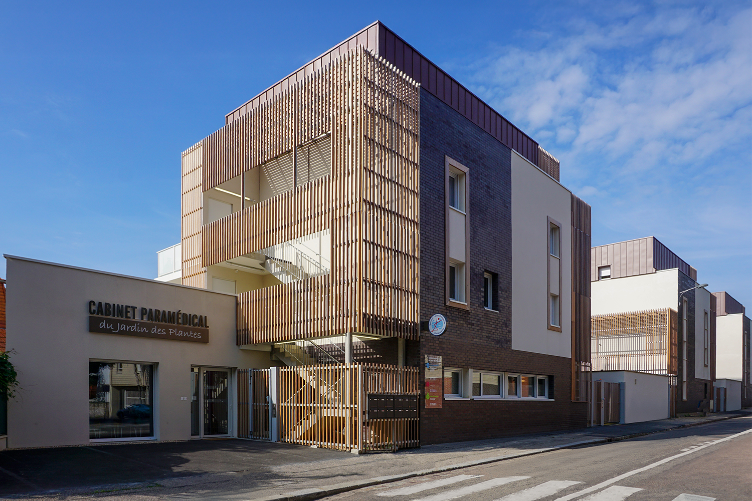 L’immeuble collectif sur rue met l’accent sur le jeu des volumes simples prolongés ou couronnés par les terrasses des logements. Un traitement minimaliste vient contraster l’assise du bâtiment composé de claustras et d’un soubassement en brique inspirés des rythmes graphiques de la botanique faisant ainsi un clin d’œil à la proximité du jardin des plantes.