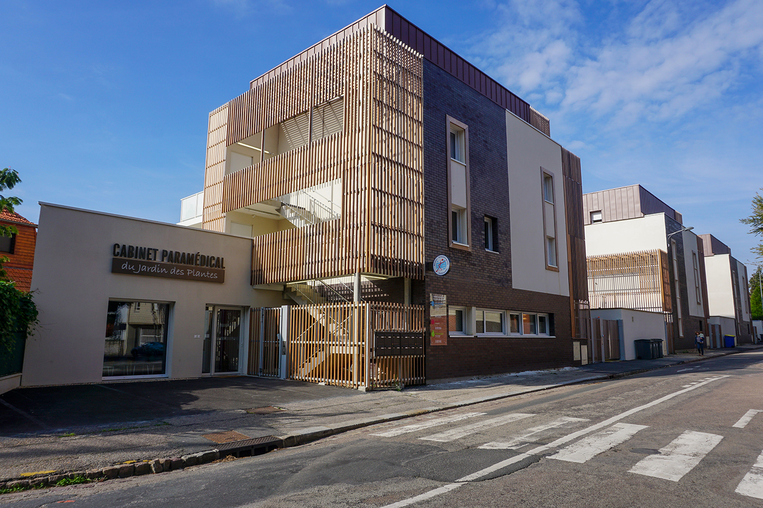 Situé au cœur d’un « ensemble bâti homogène protégé » à l’Est du jardin des plantes, le projet est construit pour intégrer et gérer le contraste existant entre les volumétries des pavillons jumelés aux imposants toits de tuiles et des petits immeubles collectifs, qui témoignent du récent développement urbain.