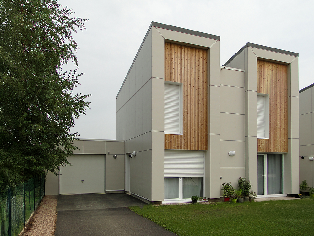 Les maisons sont réalisées en OSB, panneaux plans de fibro-ciment de teinte blanc cassé, de clin bois de teinte naturelle et de panneaux en métal laqué à joints debouts de couleur anthracite. Les bâtiments sont construits selon les réglementations RT 2012 pour la thermique et PMR pour l’accessibilité.